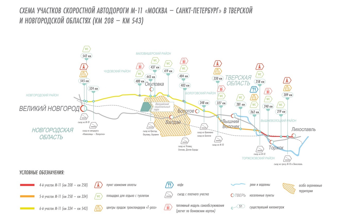 Ранее были полностью построены и введены в платную эксплуатацию головной участок с 15 – 58 км в Московской области (Москва — Солнечногорск, обход г. Химки), 258 – 334 км (обход Вышнего Волочка в Тверской области) и 208 – 258-й км (обход г. Торжка).